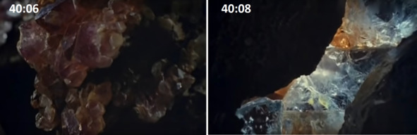 Аналогичные кадры 40:17 и 40:28 показывают минералы красного, белого, синего цветов. Создатели фильма предполагали, что в лунных пещерах могли находиться драгоценные камни и драгоценные металлы: серебро, платина, золото. Американская версия о том, что вся лунная поверхность имеет серебристо белый цвет, полностью опровергается кадрами фильма Клушанцева. Это касается кадров, которые демонстрировали разноцветные камни лунной пещеры. Кадры других участков Луны, показанных в фильме, тоже не являются светло серебристыми. Фильм Клушанцева показал разноцветную Луну!