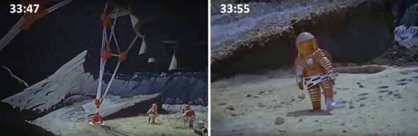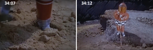 Ретивые пособники американского обмана изменили яркость и насыщенность цвета на кадрах фильма. Но это изменение, если он было, не помогло версии обманщиков. Но это изменение, если он было, не помогло версии обманщиков. Лунный грунт в фильме Клушанцева выглядит бледно салатовым цветом. Следующие кадры лунной поверхности 34:07, 34:12 показали бежевый цвет грунта и синеватый оттенок скальных пород. В фильме с яркими красками эти цвета выглядят более яркими и очевидными. Защитники американского обмана могли корректировать кадры фильмов, где Луна была не серого цвета.