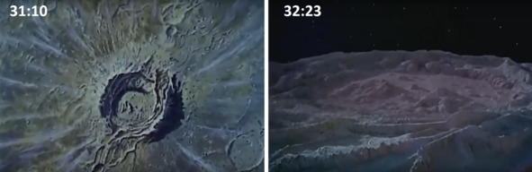 За картиной извержения лавы последовали кадры, на котором поверхность Луны начала заметно меняться. На кадре 3:10 поверхность окрасилась в зеленоватый цвет. На лунной поверхности наблюдаются полосы голубоватого цвета. На кадре 32:23 центр кратера теперь окрашен в розовый цвет. В этом нет ничего удивительного, если вспомнить о том, что вместе с лавой на поверхность выходят ильменит, оливин, пироксены анортит. Это вещества, которые и составляют основу лунного реголита. Кадры лунной поверхности современной версии показывают лунный грунт в этом фильме близкой к серому цвету.