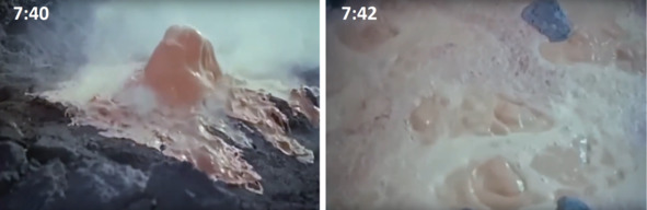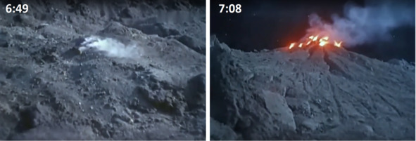 Впрочем, в начале фильма последовали кадры с хорошо знакомым цветом Луны. Это был серый цвет. Голубоватый оттенок кадра 2:31 можно счесть за неправильную настройку цветности кадра. Бывает! Казалось, все в порядке, Луна все-таки серая, американская версия торжествует. Но проблема этой демонстрации Луны в том, что режиссер показывал ее до того, как начались извержения вулканов на Луне. Оказывается Клушанцев представлял такой Луну до того как из ее недр начало вырываться плазма и пламя. Клушанцев видимо плохо представлял, как происходит горение в вакууме при извержении, где отсутствует кислород, необходимый для такого процесса. Извержение изображено в виде языков пламени, которое вырывалось из недр «лунной горы», лунного вулкана.
