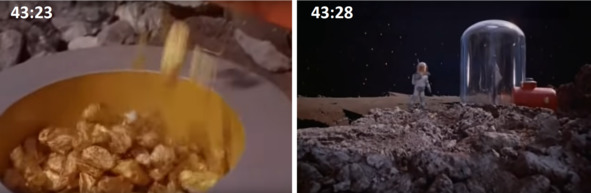 По сюжету фильма космонавты попадают в лунную пещеру. Там цвет образцов лунного грунта однозначно не является светло серебристым. Кадр 40:06 демонстрирует бордовые, розовые, красные цвета минералов. На кадре 40:08 минерал представлен в белом цвете с крупными вкраплениями ярко янтарного цвета.