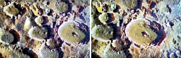 Нетрудно сравнить кадры этого фильма с кадрами фильма, где произошла корректировка цвета в угоду серому «лунному» цвету. Кадры 2:28, 2:41, 3:10, 3:18 показывают разнообразие цветов лунной поверхности, которая в корне отличается от цвета американской «Луны»!