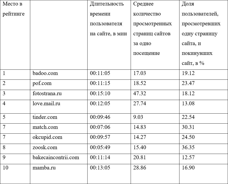 По данным SimilarWeb[49], рейтинг лучших сайтов в категории «Романтика и отношения в мире» возглавляет badoo.com, дальше в порядке убывания – pof.com, fotostrana.ru (Таблица 2).