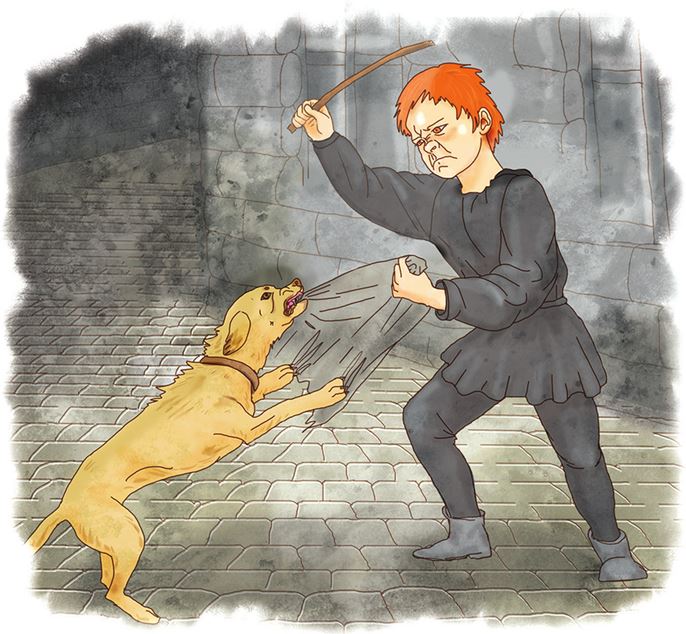 Вечером Хельга пошла прогуляться. Во дворе она наткнулась на рыжего, какого-то нескладного подростка Матиса, который дразнил гончих собак, размахивая ветошью. В ответ они громко лаяли, набрасывались на мальчугана и пытались вырвать тряпку из рук. Матис смеялся и с удовольствием ударял ею по собачьим мордам, как бы в наказание, чем ещё больше злил гончих…