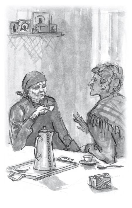 К Пелагее Ниловне пришла в гости приятельница-богаделенка, Матрёна Григорьевна. Хозяйка очень обрадовалась гостье, крепко поцеловала её и стала суетливо разводить под плитой огонь, чтобы сварить кофе.