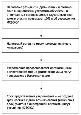 С 2015 года налогоплательщики (физические и юридические лица) обязаны уведомлять налоговый орган о своем участии в иностранных организациях (п. 3.1 ст. 23 НК РФ) в случае, если доля такого участия превышает 10 процентов. Уведомление подается разово только в случае начала/прекращения участия или если изменилась доля участия в компании/ ИСБОЮЛ.