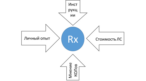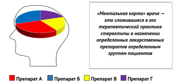 Изучая приверженность врачей тем или иным препаратам, мы пришли к выводу, что алгоритм назначений врача определяется сформировавшейся у него на данный момент так называемой «ментальной картой» врача, то есть отражает сформировавшиеся у него привычки назначения лекарственных препаратов / схем лечения.