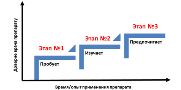 Таким образом, как минимум 50% и более врачей проходят через несколько основных обязательных этапов в развитии своего доверия новому для себя лекарственному препарату.