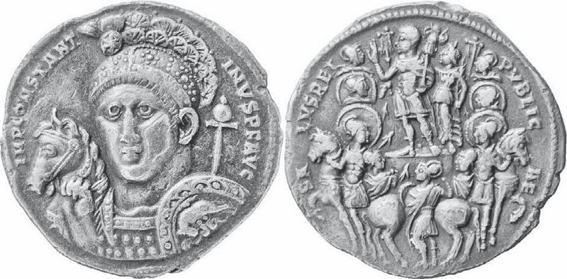 Серебряный медальон из Тицинума (совр. Павии), датируемый 315 г. На аверсе изображен император Константин I в шлеме с христограммой (ΧΡ)