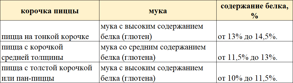 Большинство корочек пиццы выпекаются из муки для выпекания хлеба. Хотя нет жесткого и единого правила относительно уровня белка в муке для выпекания пиццы, следующие значения могут быть использованы в качестве руководства.