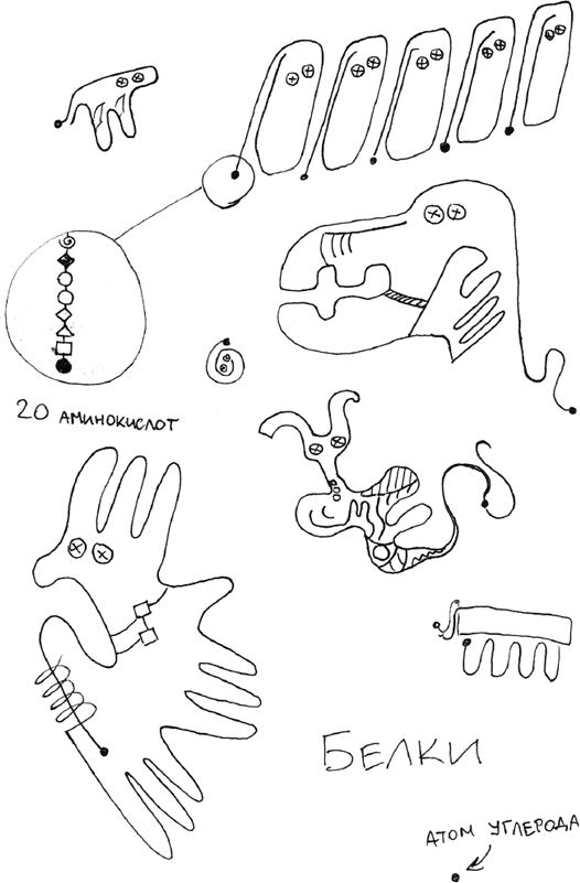 Эти разнообразные белки правят живым организмом. Как рабочие разных профессий, они делают все, что только можно в нем делать. Мы перевариваем пищу с помощью белков, дышим кислородом с помощью белков, двигаемся с помощью белков. Белки копируют ДНК, синтезируют клеточную мембрану, а при формировании долгосрочной памяти белки в гиппокампе отправляют при помощи белков белковые сигналы другим белкам в кору. Всего у человека порядка 20 000 разных белков