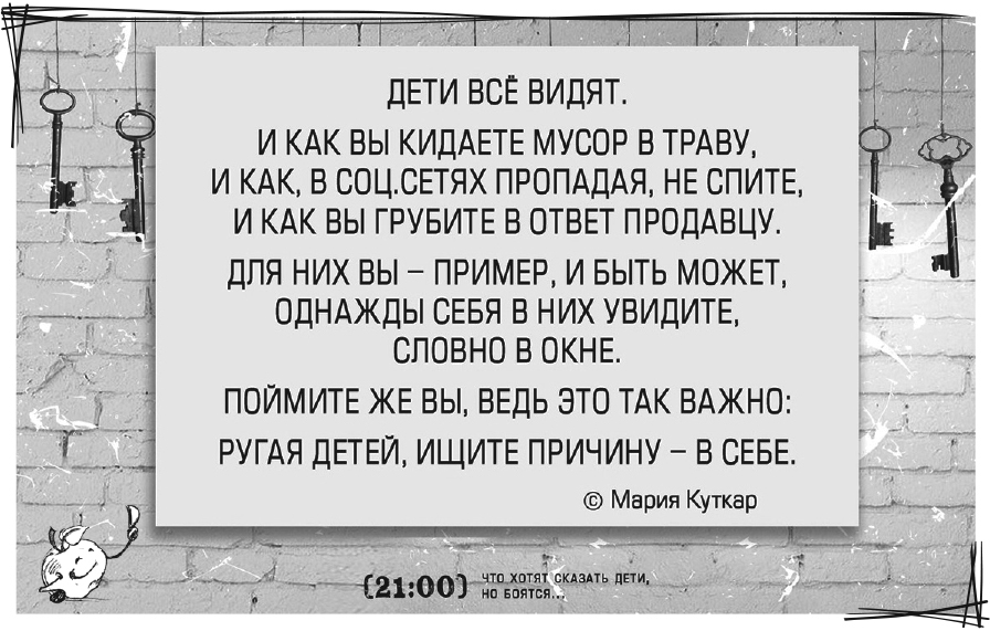 Каждый раз, когда мы делаем что-то, что запрещаем ребенку, мы его, пусть на толику, но предаем… А если запрещаем, не потрудившись объяснить на понятном ему языке, почему ему нельзя, не только Личность в нем подавляем, но и сажаем семена целого букета психологических проблем, которые могут в будущем дать плохие плоды. В глубине своей души ребенок так хочет походить на нас, он так желает тождественности со своими самыми родными людьми – мамой и папой, а мы своим бесцеремонным поведением демонстрируем, что он пока еще маленький, чтобы быть нам ровней. Пока ему надо подрасти и уж когда он подрастет, мы смело запишем его в клуб людей с двойными стандартами…