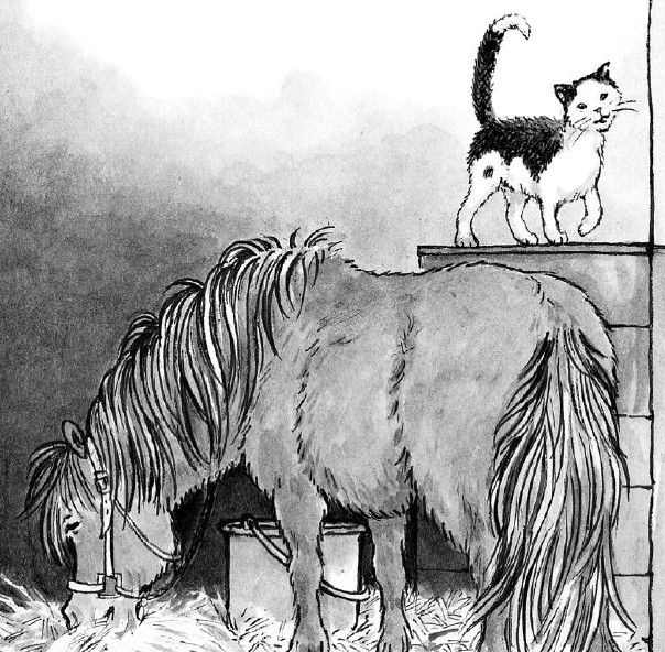 Сигге стоит в своём стойле, повернувшись головой к проходу, и сонно моргает. Когда он замечает Элину, то принимается скрести передним копытом по полу.