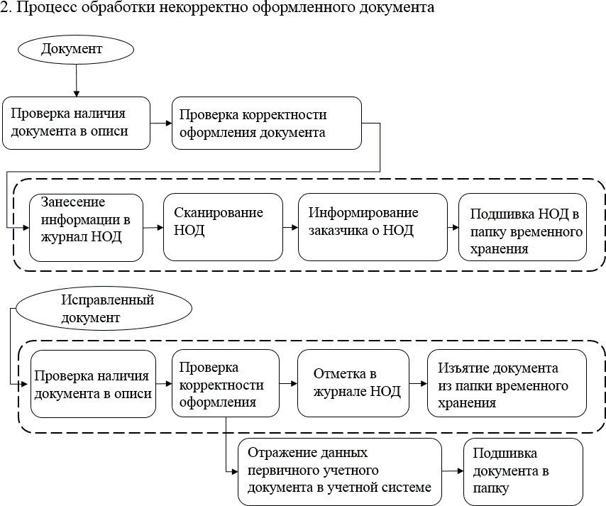 Зависимость качества полученных услуг от действий сотрудников заказчика и контрагентов заказчика. Одна из особенностей финансового аутсорсинга заключается в том, что качество оказываемых услуг зависит в том числе и от действий сотрудников и контрагентов заказчика. Самыми распространенными причинами снижения качества от действий сотрудников заказчика являются непонимание сути финансового аутсорсинга и особенностей оказания данной услуги, саботаж по причине навязывания финансового аутсорсинга со стороны руководства, несвоевременное предоставление первичных документов и информации, предоставление неполной информации по сделкам, отсутствие ответственного контактного лица, отвечающего за процесс взаимодействия, нежелание / отсутствие возможности улучшать процессы. На рисунке 1.3.1. изображен пример обработки корректно и некорректно оформленных документов. В случае, если аутсорсеру поступил документ, соответствующий всем требованиям, для обработки документа требуется четыре действия, в противном случае – двенадцать. Обработка некорректных документов увеличит не только стоимость оказания услуг, но и замедлит сроки обработки. Поэтому количество некорректно оформленных документов, поступающих на обработку к аутсорсеру, необходимо снизить до минимально возможного уровня.