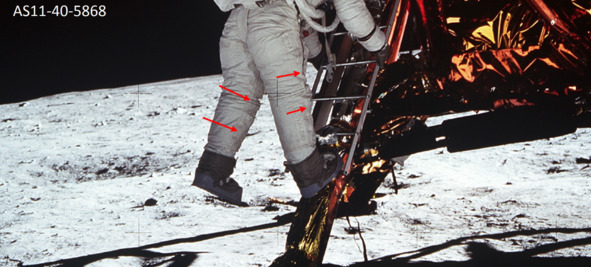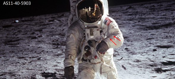Описание фотографии: «AS11-40-5903 (20 июля 1969 г.) – Астронавт Эдвин Э. Олдрин-младший, пилот лунного модуля, стоит на поверхности Луны возле ноги лунного модуля (ЛМ) „Орел“ во время внеземного полета Аполлона-11, вне корабельная активность (EVA)». [2] Стрелками отмечен шов на рукаве левой руки скафандра американского «космонавта». Лучше бы было для американских обманщиков, если бы они заказали изготовление «скафандров» не на фабрике по изготовлению нижнего женского белья, а на заводе резиновых игрушек… или резиновой обуви.