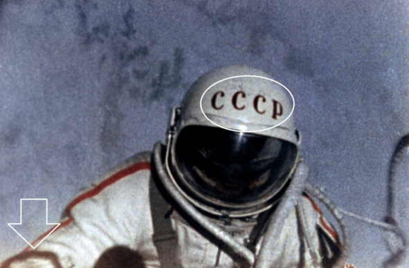 Описание фотографии: «Скафандр „Беркут“ предназначался для выхода в космос. Использовался Беляевым и Леоновым в 1965 году. Масса скафандра без ранца 20 кг». [5] Для справки: «Кираса – элемент исторического нательного защитного снаряжения, состоящий из грудной и спинной пластин, изогнутых в соответствии с анатомической формой груди и спины человека». Настораживает, что на гермошлеме нет надписи СССР. Такая надпись фигурировала в кадрах официальной трансляции о выходе человека в открытый космос. Кроме этого, на правой руке в космосе имеется окантовка шеврона коричневого цвета. В музее такого «узора» на правой руке нет. Шланги, идущие к ранцу, расположены в рассматриваемых случаях по-разному. Ниже представлен кадр из знаменитой трансляции выхода в космос. Изображение хорошего качества стало поводом для сомнений в реальности выхода в космос космонавта Леонова. В этом случае, можно предположить, что, костюм из музея дубликат, или съемка с хорошими кадрами делалась в студии. Такая практика существовала. Это не секрет. Пример: фильм про Гагарина.