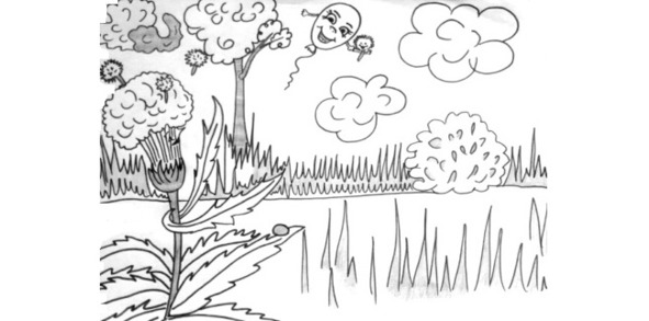 На опушке леса на зелёной полянке жил одуванчик. У него были красивые резные листочки и жёлтая шапочка.