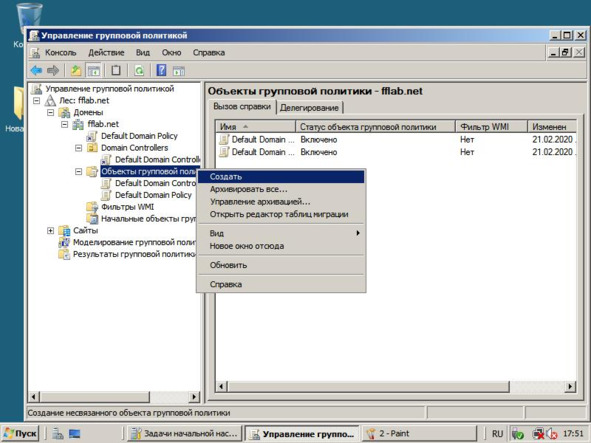 Перейдем по пути: Пуск-Администрирование-Управление групповой политикой, откроем наш лес и домен, в папке «Объекты групповой политики» создадим новый объект (рисунок 5.3).