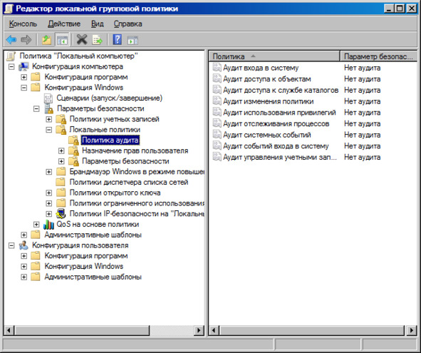 В открывшемся окне переходим по пути: Конфигурация компьютера-Конфигурация Windows-Параметры безопасности-Локальные политики-Политика аудита (рисунок 4.2).