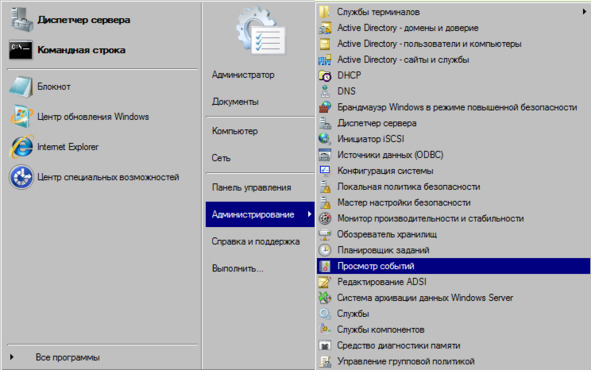 Для просмотра данных событий открываем Оснастку «Просмотр событий» – нажимаем меню Пуск – пишем в строку поиска «Просмотр событий» или открываем данный пункт в меню «Администрирование» (рисунок 4.4).