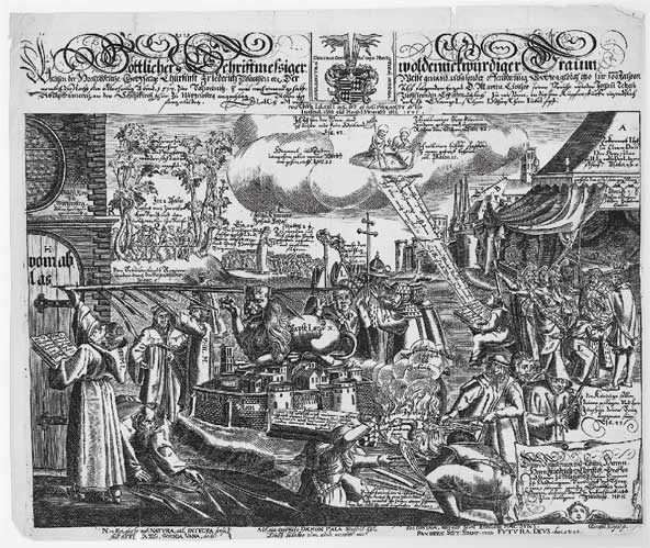 Празднование столетнего юбилея Реформации дает нам яркую иллюстрацию этого процесса. Годовщина смерти Лютера или дата начала Реформации отмечалась в некоторых имперских городах уже в 1540-х гг., но празднования в 1617 г. сопровождались более широкомасштабным и специфическим действом. Желание отметить вековой юбилей в меньшей степени коренилось в лютеранском благочестии, чем в политической и культурной ситуации начала XVII века, поскольку постоянные конфессиональные раздоры, длившиеся среди протестантов десятилетиями, происходили в условиях возрождающегося католичества. В Рейнской области и в Пфальце курфюрст Фридрих взял на себя инициативу по созданию единого самосознания в лютеранстве[8]. В Виттенберге празднования «юбилея» Лютера были сдобрены весьма жесткой антикатолической риторикой. В течение трех дней там читали основанные на библейских текстах проповеди, в которых папа римский превращался то в Антихриста, то в Вавилонскую блудницу[9], а истинно верующие лютеране представали гонимыми страдальцами. Празднование столетия Лютера привело к применению в полемическом арсенале самых разнообразных видов идеологических вооружений. Самое видное место занимали проповеди, но и гравюры на дереве, памфлеты и театрализованные представления, монеты и медали – все это представляло Лютера основателем реформированной веры. Монах Лютер был избран Богом для того, чтобы уничтожить суеверия и идолопоклонство монашества; сам Господь уполномочил этого человека противостоять силе и власти средневековой Церкви. Память о Лютере выстраивалась со всевозможным тщанием. Священники читали проповеди по установленному образцу, а светские и церковные власти предлагали верующим только те образы и речи, которые позволяли им в нужном ключе думать о Реформации как о совокупности идей и историческом событии. В этом праздновании ключевым моментом была не смерть Лютера, а события октября 1517 г., когда Лютер, как гласила история, прибил свои 95 тезисов к дверям Замковой церкви в Виттенберге[10]. Язык юбилея резонировал с теорией чистилища и порожденных ею религиозных практик, но введение юбилея в официальный календарь создало культовый прецедент для иконоборческой Реформации. Возможно, самую знаменитую иллюстрацию этого можно увидеть в гравюре 1617 г. «Сновидение Фридриха Мудрого» (The Dream of Friedrich the Elector)[11]. Фридрих Саксонский так рассказывал своему брату Иоганну об этом сне[12]. Помолившись за души в чистилище, Фридрих заснул: