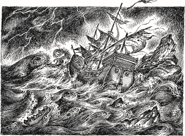 Но вот однажды, при переходе в Восточную Индию, корабль настигла страшная буря. Ветер и волны погнали его неизвестно куда.