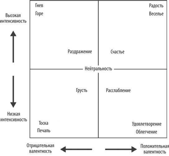 Кроме изменения интенсивности при смене темпа мы также можем варьировать вкус эмоций. Психологи называют это эмоциональной валентностью. Например, ярость, горе и страх имеют высокую интенсивность, но у них разная валентность. Удовлетворение, облегчение и подавленность – это эмоции низкой интенсивности с разными валентностями. Мы можем даже изобразить эмоции на рисунке, расположив их в зависимости от валентности и интенсивности: