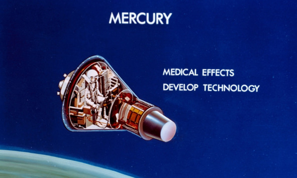 Подпись к изображению: «S64—01123 (1964) – авторская концепция, иллюстрирующая относительные размеры космического корабля „Меркурий“ с одним человеком, космического корабля „Близнецы“ с двумя людьми и космического корабля „Аполлон“ из трех человек». [3] Параметры капсулы «Меркурий»: «Масса: 1355 кг; Длина: 4,03 м; Максимальный диаметр: 1,89 м; Обитаемый объём: 1,7 м³». [4]