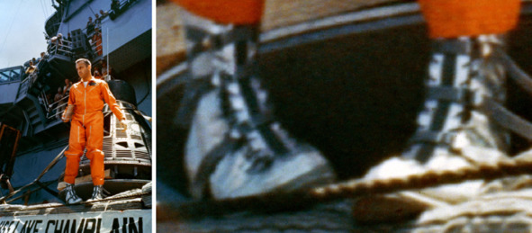 Увеличенный фрагмент фотографии НАСА: «S88—31385 (5 мая 1961 г.) – Астронавт Алан Б. Шепард-младший готовится уйти от капсулы Freedom 7 после инспекции после полета на борту авианосца ВМС США». [5] По фотографии Шепарда можно увидеть признаки его заболевания: косолапости. В СССР с таким тяжелым заболевание в космонавты не брали! Если верить американской мифологии, второй клоун американского представления с «пилотируемыми полетами» Гриссом вел себя при спуске не очень логично и порой на грани аномального поведения: «Готовясь к приземлению, он отсоединил гермошлем и был готов покинуть капсулу. Шлем не поддавался, но Гриссом „открутил“ его от скафандра и стал думать о том, как быстрее выбраться из космического корабля. Вертолёты Поисковой службы, которые взлетели во время запуска и визуально следили за следами инверсии ракеты и спуском парашютов, находились на расстоянии приблизительно 3,2 км от места приводнения. Лейтенант Джеймс Л. Льюис, пилот основного вертолёта Поиска, радировал Гриссому и спросил, готов ли он к погрузке. Гриссом попросил подождать пять минут, в это время он делал записи данных в кабине. Делать записи в перчатках скафандра было неудобно и долго, и несколько раз вентиляция скафандра вздувала пузырь на груди астронавта, пилот просто просовывал палец между шеей и облачением, выпуская воздух». [7]
