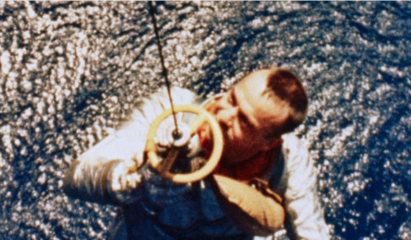 Кроме того, он забыл закрыть свой входной клапан, через него скафандр стал наполняться водой. Плавание становилось все более затруднительным, и теперь в ожидании второго вертолёта, он начал осознавать опасность своего положения. Качаясь на волнах, Гриссом, сердитый, искал пловцов с вертолётов, которые могли бы ему помочь удержаться на плаву. Тут он заметил знакомое лицо – Джорджа Кокса – на борту подлетающего вертолёта. Кокс был вторым пилотом, встречал и шимпанзе Хэма и Алана Шепарда в предыдущих полётах Меркурия. У Гриссома уже только голова оставалась над водой, он встретился с Коксом взглядом, тот все понял. Гриссому бросили канат, астронавт немедленно себя обмотал и завязал узел. Пока его подтаскивали, скафандр продолжал набирать воду и раздуваться. Гриссом плавал всего четыре или пять минут, «но мне это показалось вечностью», – признался он позже». [7] Даже, если это постановочная клоунада, совершенно очевидно, что клоун НАСА не годится на такую роль как «национальный герой США». Он был не адекватным человеком с импульсивным поведением.