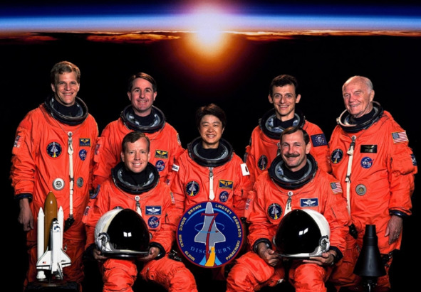 Подпись под фотографией, сделанной до осуществления этого, мягко говоря, сомнительного «полета» в зоне РПЗ: «Пять астронавтов, базирующихся в Космическом центре имени Джонсона (АО), и два специалиста по полезной нагрузке делают перерыв в своем расписании тренировок, чтобы позировать для предполетного портрета STS-95. Сидят астронавты Кертис л. Браун-младший (справа), командир миссии; и Стивен В. Линдси, пилот. Слева стоят Скотт Ф. Паразински и Стивен К. Робинсон, оба специалисты миссии; Тиаки Мукаи, специалист по полезной нагрузке, представляющий японское Национальное Агентство космического развития (НАСДА); Педро Дуке, специалист по миссии, представляющий Европейское космическое агентство (ЕКА); и сенатор США Джон Х. Гленн-младший, специалист по полезной нагрузке. Семь из них планируется запустить на околоземную орбиту на борту космического челнока «Дискавери» в конце октября этого года». [10] Ко времени второго космического полёта Гленну исполнилось 77 лет; таким образом, он стал самым пожилым человеком в космосе на данный момент». [9] Очередное американское «чудо»! Фальшивый рекорд!