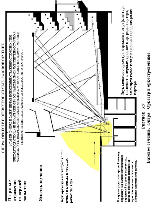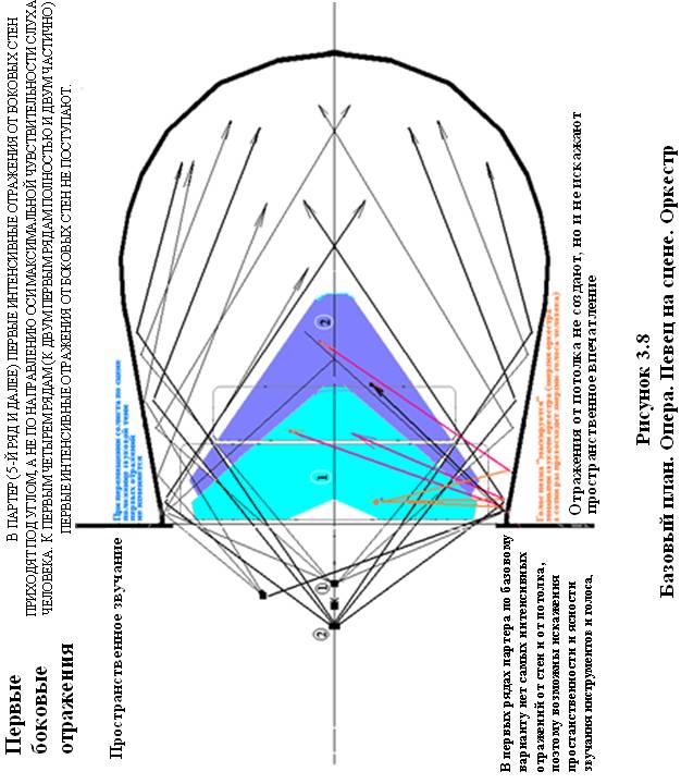 В оперном зале главные действующие лица (главные создатели гармонии) ― это певец, оркестр и дирижер. Естественные голоса певца и оркестра по энергии различаются в сотни раз. Анализ базового варианта показывает, что при удалении певца на расстояние 7м от портала интенсивные отражения голоса от рефлектора и акустического потолка в партере отсутствуют и поступают только на ярусы, а при удалении певца на расстояние 2.5м от портала интенсивные отражения голоса поступают только в последние ряды партера. В то же время, звук мощного оркестра, отражаясь от акустического отражателя, попадает в первые, средние и др. ряды партера, маскируя голос певца в первых и средних рядах партера (рисунок 3.11).