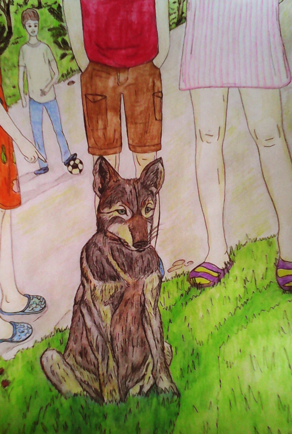 Подходя к лагерю, ребята услышали детский смех и удивились. Может, цирк какой приехал или новая игра, надо узнать. Во дворе они увидели детей, которые то и дело кого-то гладили. Неожиданно, прямо из-под ног этих детей, выбегает волчонок и подбегает к своим уже полюбившимся трём хозяевам и начинает ластиться и прыгать.