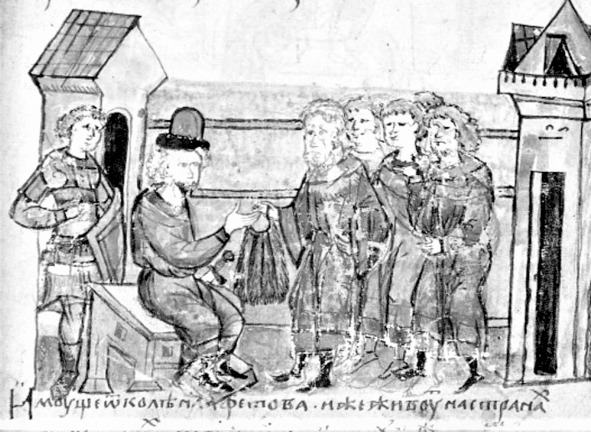 Рисунок 4. Изображение «гривны кун» в Радзивиловской летописи: «Розные языки дань дают Руси» [71]