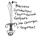 – Ух ты! – восхитился Забияка. – Это же Новейший Обоюдоострый Сверхскоростной Супермеч! Изогнутый внутренний край, посеребренное острие… где ты его взял, Сморкала?
