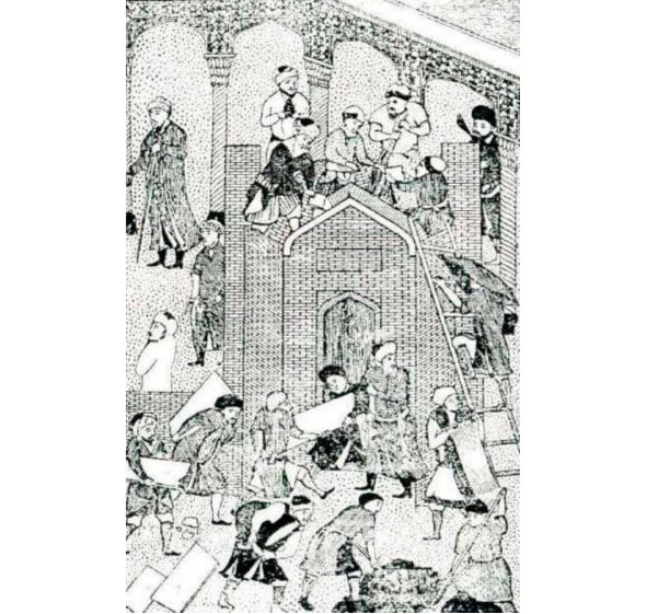1-расм. Бибихоним масжидининг қурилиши. Расм юқорисидаги бош меъмор қўлида бино макети кўрсатилган. «Зафарнома"га ишланган миниатюрадан олинган