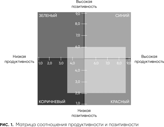 Соотношение продуктивности и позитивности можно изобразить в виде графика с двумя осями. Пусть горизонтальная ось будет осью продуктивности. Команды с высокими критериями продуктивности будут находиться в правой части графика, а команды с низкой продуктивностью – в левой. Вертикальная ось будет осью позитивности. Соответственно высокопозитивные команды будут находиться в верхней части графика, а низкопозитивные – в нижней. Любая команда попадает в какой-то один из четырех квадрантов, образованных осями.
