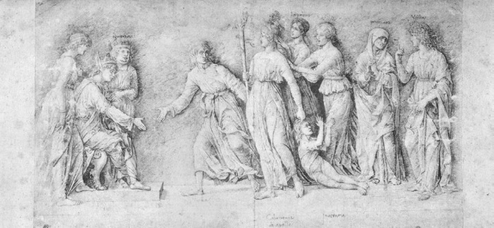 Андреа Мантенья «Клевета Апеллеса», эскиз, втор. пол. XV в., бумага, перо коричневым тоном, подсветка белым