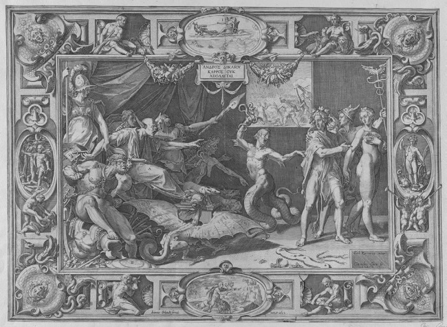 Корнелис Корт «Клевета Апеллеса», реплика[1] картины Федерико Цуккаро, 1572, гравюра на слоновой кости