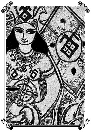 На кощуне изображен Велес – бог лесов, зверей и мудрости бытия. Руна, которую несет в себе кощун, называется Веди – это мощнейший источник, дающий возможность обучать и обучаться. Фонетически руна схожа с одноименной буквой старых русских алфавитов глаголицы и кириллицы. Веди дает возможность расширять границы пространства, расширять горизонты, расширять сознание. Она – руна-проводник по мирам сознания, и только в колоде «Черты и Резы» настолько раскрывается ипостась хозяина кощуна, – Велеса, как бога мудрости бытия и носителя Знаний. (Знания имеются в виду высшие, поэтому осознанно написано с заглавной.)