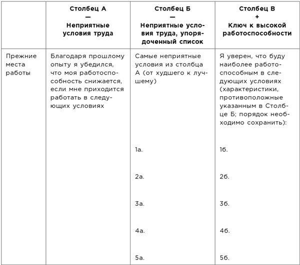 Как было упомянуто выше, проще всего нужно заполнить данную таблицу, вспомнив все, что вам не нравилось на каждом из прежних мест работы, после чего – «отразить» список. (При желании можно перед заполнением распечатать таблицу на листе формата А4.) В столбец А можно записывать такие характеристики, как: «слишком шумно», «повсюду камеры», «нет окон», «обязательно приходить к шести утра» и так далее.
