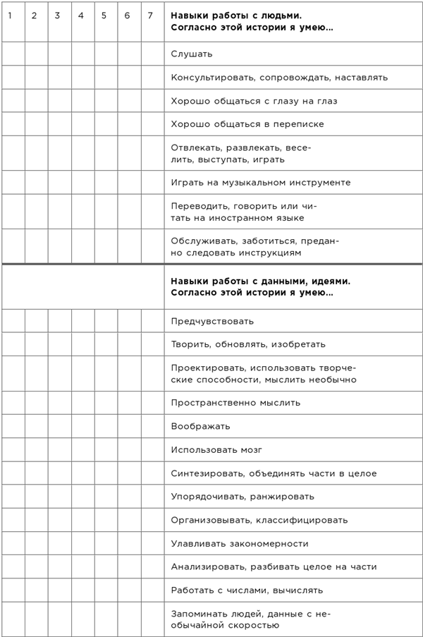 Поэтому, изучив семь историй (или, если вам некогда, пять), взгляните на «решетку навыков» и попробуйте прикинуть, какие десять навыков могут нравиться вам больше всего. Выбирайте лучшие варианты из тех, что вы прикинете, и самые интересные вам навыки: не те, которые, как вам кажется, нужны рынку, а те, которые вам больше всего нравится задействовать.