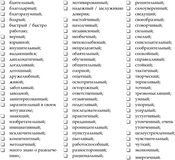 Почему так важно упоминать черты характера? Что ж, «я умею скрупулезно и логично организовывать данные» и «я умею организовывать данные мгновенно, по наитию» – два совершенно разных навыка. Разница между ними прослеживается не в глаголе и не в существительном, а в сочетании с наречием или прилагательным. Так что расширяйте определение десяти самых важных для вас навыков, выбранных в соответствии с моими указаниями.