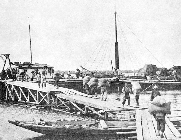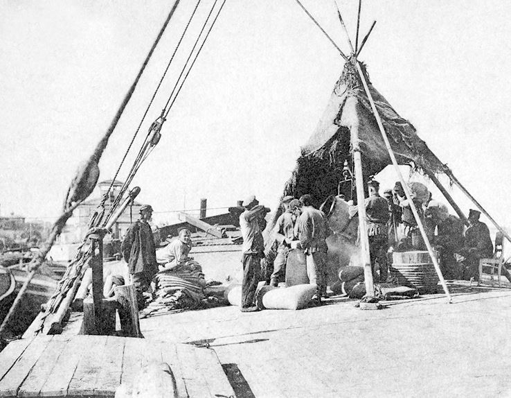 Наконец, один старик указал Владимиру на четырех загорелых оборванцев. Те сидели на груде досок и пили водку, закусывая кренделями и вареной печёнкой. Налили и Владимиру. Тот, в свою очередь, поставил штоф от себя. Без расспросов, не посмотрев паспорта, приняли бурлаки Гиляровского в свою артель. На базаре продали его кожаные сапоги, вместо них купили онучи и три пары лаптей.