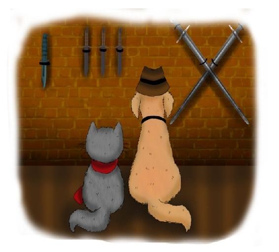 Na parede, havia várias espadas, adagas e outras coisas do gênero.