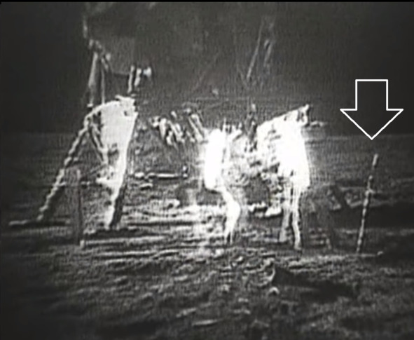 Шоу американских фальсификаторов оказалось на грани провала. Американским пропагандистам пришлось придумывать нелепые оправдания о том, что этот «стержень», отмеченный стрелкой, проявился как паразитическое изображение левой стойки «Лунного модуля». Были и другие версии менее фантастические, которые утверждали, что это образование результат попадания липкой лунной пыли. Но первую абсурдную выдумку опровергали кадры «лунной трансляции», где проявлялся этот «стержень», и на которых «ЛМ» отсутствовал. Вторую выдумку опровергали кадры, на которых стержень неожиданно исчезал, при изменении освещения объектива телекамеры. Этот «предмет» оказался чередой капелек воды, которые образовали небольшой отрезок на внешней стороне линзы. Понятно, что в настоящем космосе подобное появление на внешней стороне линзы конденсата, капель жидкой воды, невозможно.