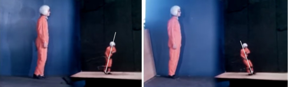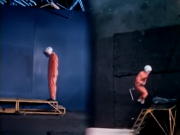 На кадрах справа опять при окончании прыжка испытатель при уменьшенной гравитации потерял равновесие. Если бы не поддержка специальных лонжей пилот бы упал на спину вниз. Скользким на «Луне» будет не только грунт, но и любая поверхность по которой будет передвигаться американский «космонавт». Помост тоже становится скользким. Испытатель рискует постоянно упасть на поверхность нижней опоры.
