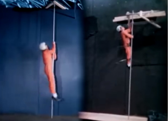 Американские «ученые» очень любят делать порой бессмысленные «исследования», которые граничат с абсурдом и нелепостью. Этого у них не отнимешь. В данном опыте не обошлось без таких моментов, которые очевидно не имели никакого смысла для определения особенностей лунной гравитации. Специалисты НАСА определяли, кто быстрее вскарабкается по шесту, испытатель в условиях обычной гравитации или пилот в ситуации уменьшенного тяготения. Победитель на кадре справа.