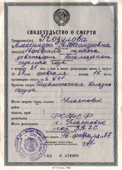Свидетельство за № 478905 о смерти Козуловой А. А., выданное Ульяновским городским отделом ЗАГС. 16 февраля 1987 г.[100]