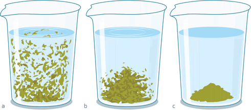 3. Опыт Эйнштейна. Воду с чаинками размешивают ложечкой (а). Вскоре чаинки собираются в центре стакана (b) и в конечном итоге опускаются на дно (c). Их движение доказывает наличие вертикальных вихрей, хотя их существование, кажется, противоречит интуиции
